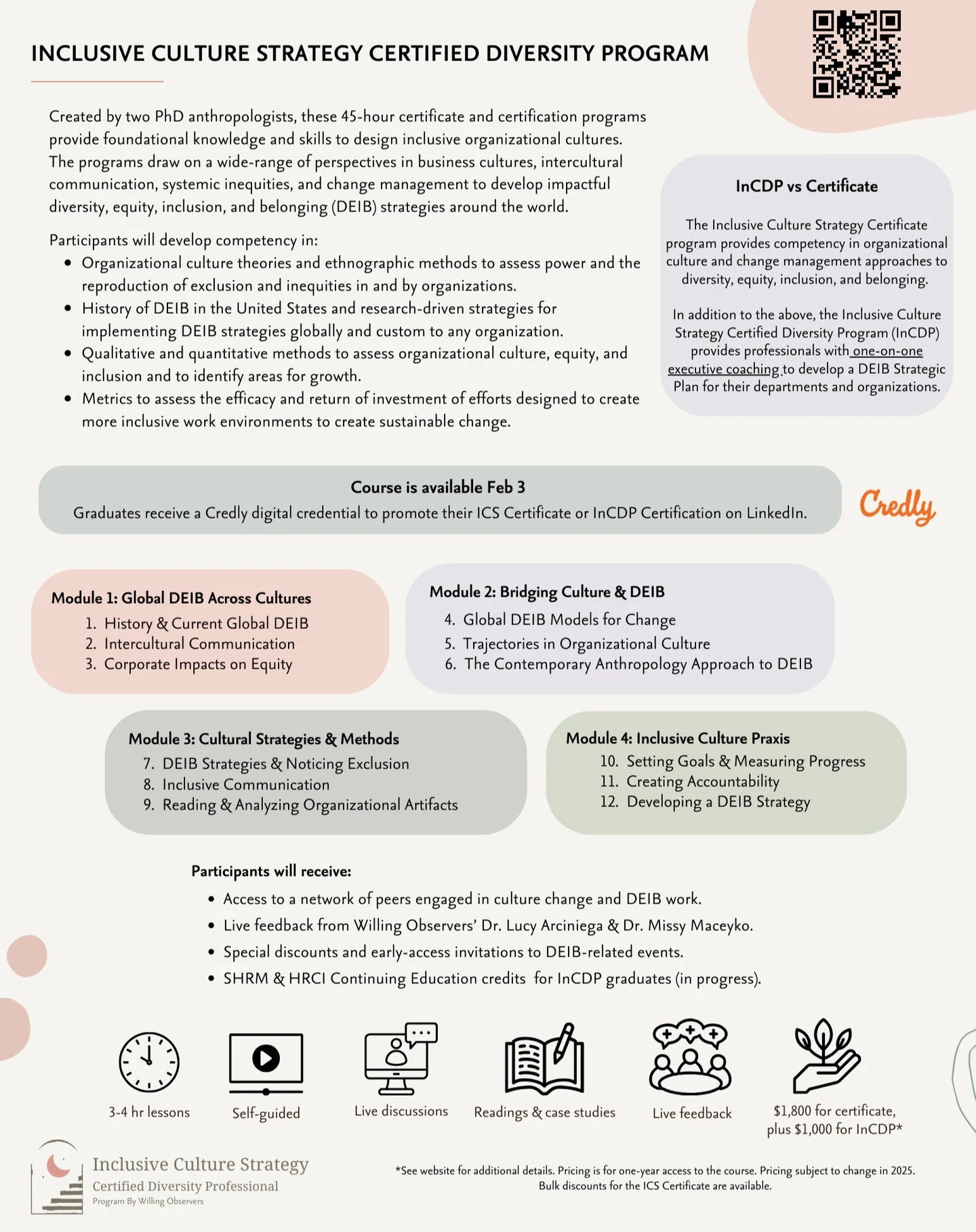 The Willing Observersβ Inclusive Culture Strategy (ICS) Certificate and Inclusive Culture Strategy Certified Diversity Professional (InCDP) Certification programs provide participants with the knowledge, skillset, and toolkits to design inclusive organizational cultures.