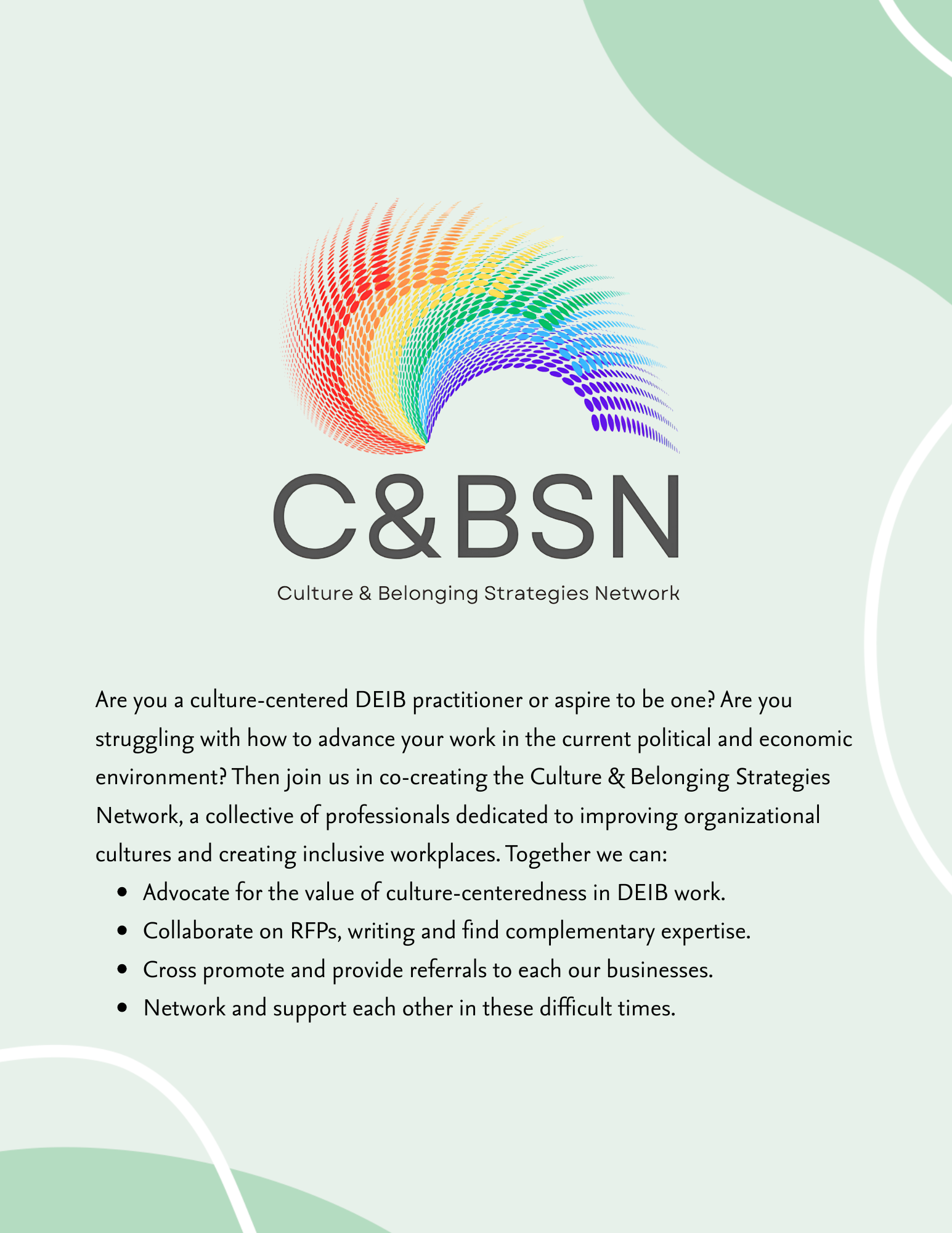 The C&BSN is a hub for organizations to connect with culture and belonging experts. Our experts know that each organization is unique and nuanced, and as such, take a cultural approach to provide tailored solutions to management, product-design, consumer research, and more.